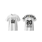 Diseño Bold: Gran estampado trasero “SUPREME 20” que se extiende de hombro a hombro y detalle frontal minimalista.